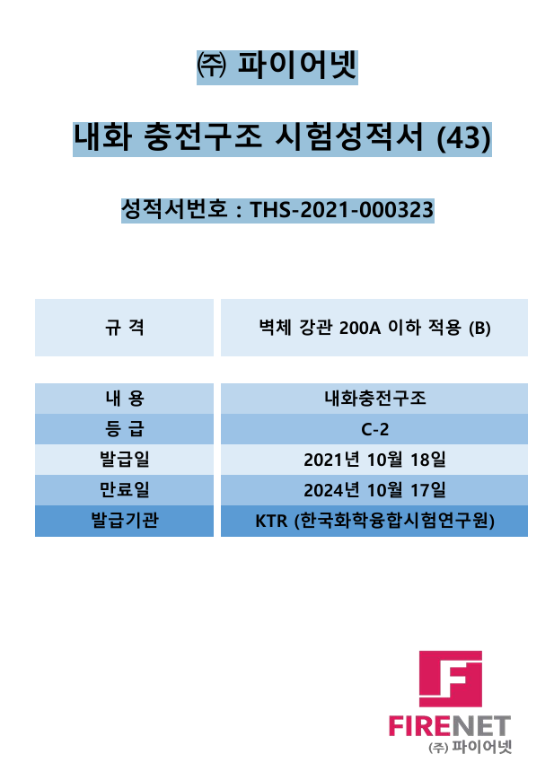 ㈜ 파이어넷 내화 충전구조 시험성적서(벽체강관 200A이하적용(B)) (43) 성적서번호 : THS-2021-000323