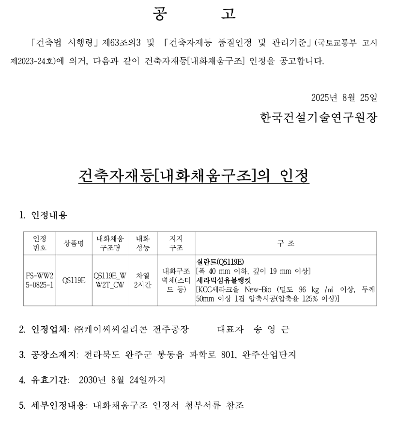 [신규인정] ㈜케이씨씨실리콘 전주공장(063-260-1700) [QS119E_WW2T_CW 등 총 1개 구조]