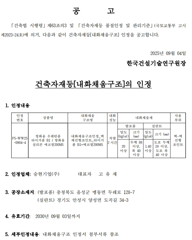 [신규인정] 승현기업㈜ (043-537-4933) [타이거폼 B1+에코씰200MS 등 총 1개 구조]